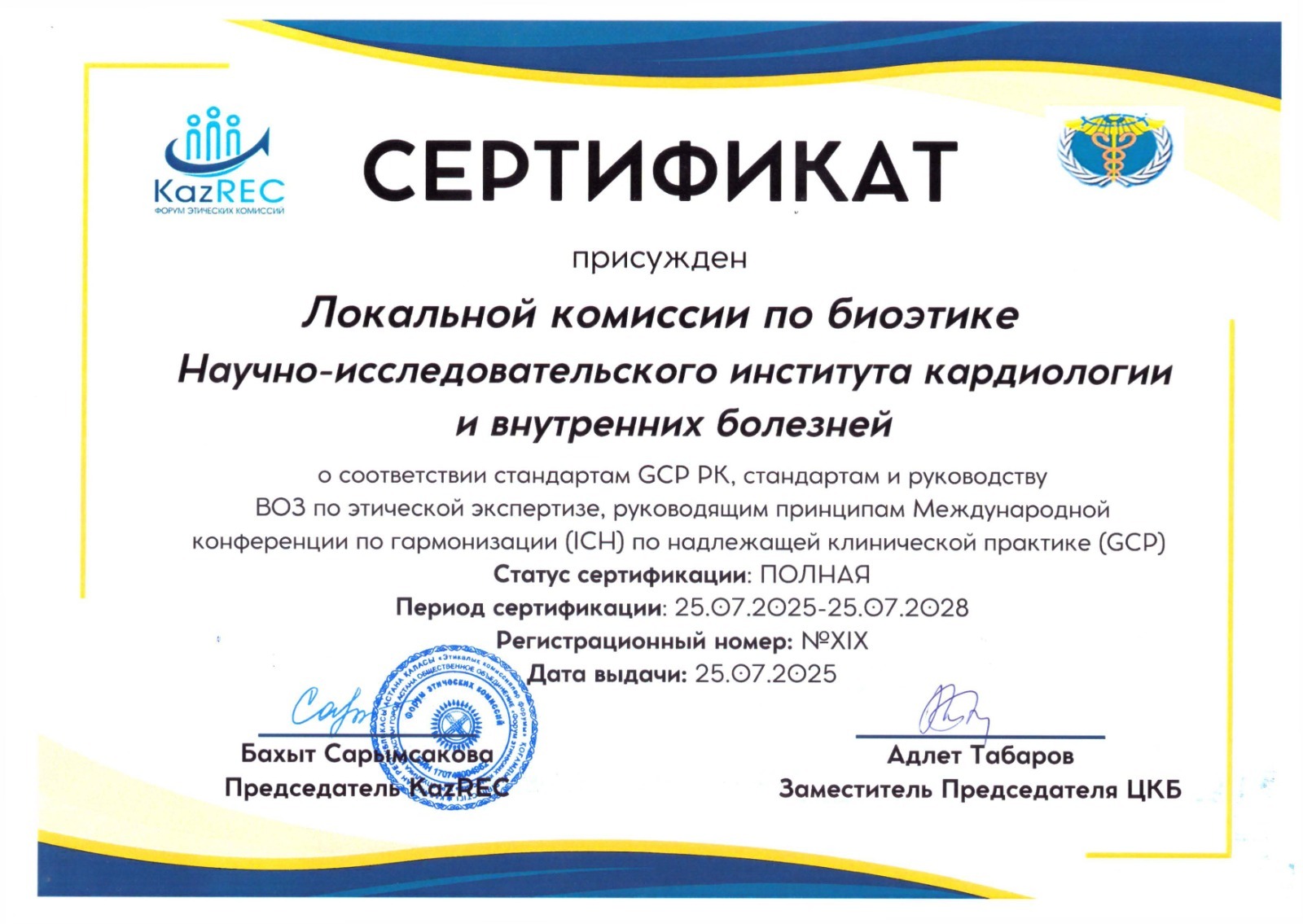 Локальной комиссии по биоэтике НИИ кардиологии присужден сертификат соответствия стандартам GCP РК, стандартам и руководству ВОЗ по этической экспертизе, руководящим принципам Международной конференции по гармонизации (ICH) по надлежащей клинической практике.